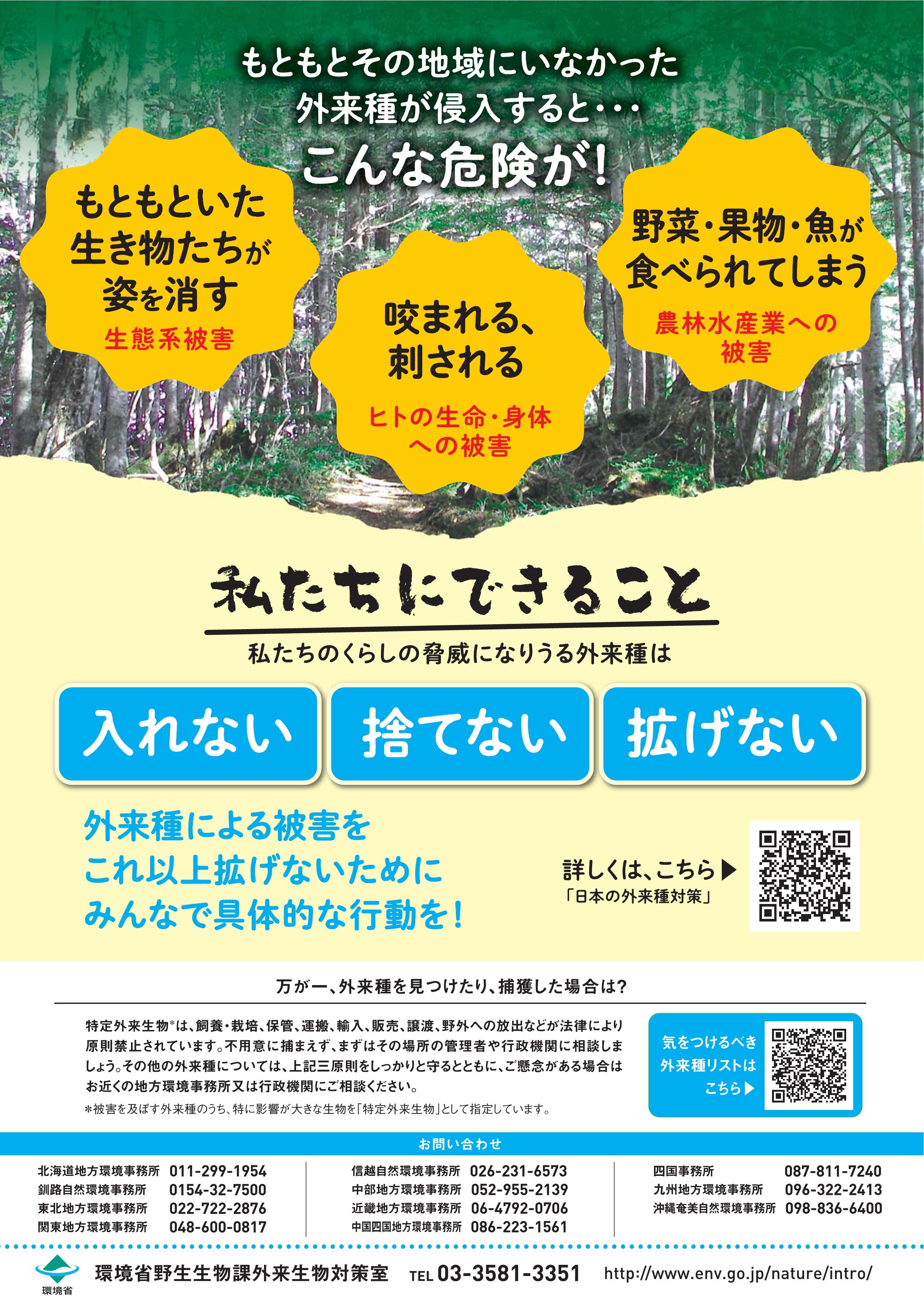 ※渡り鳥、海流にのって移動してくる魚や植物の種など、自然の力で移動するものなどは、外来生物には当たりません。