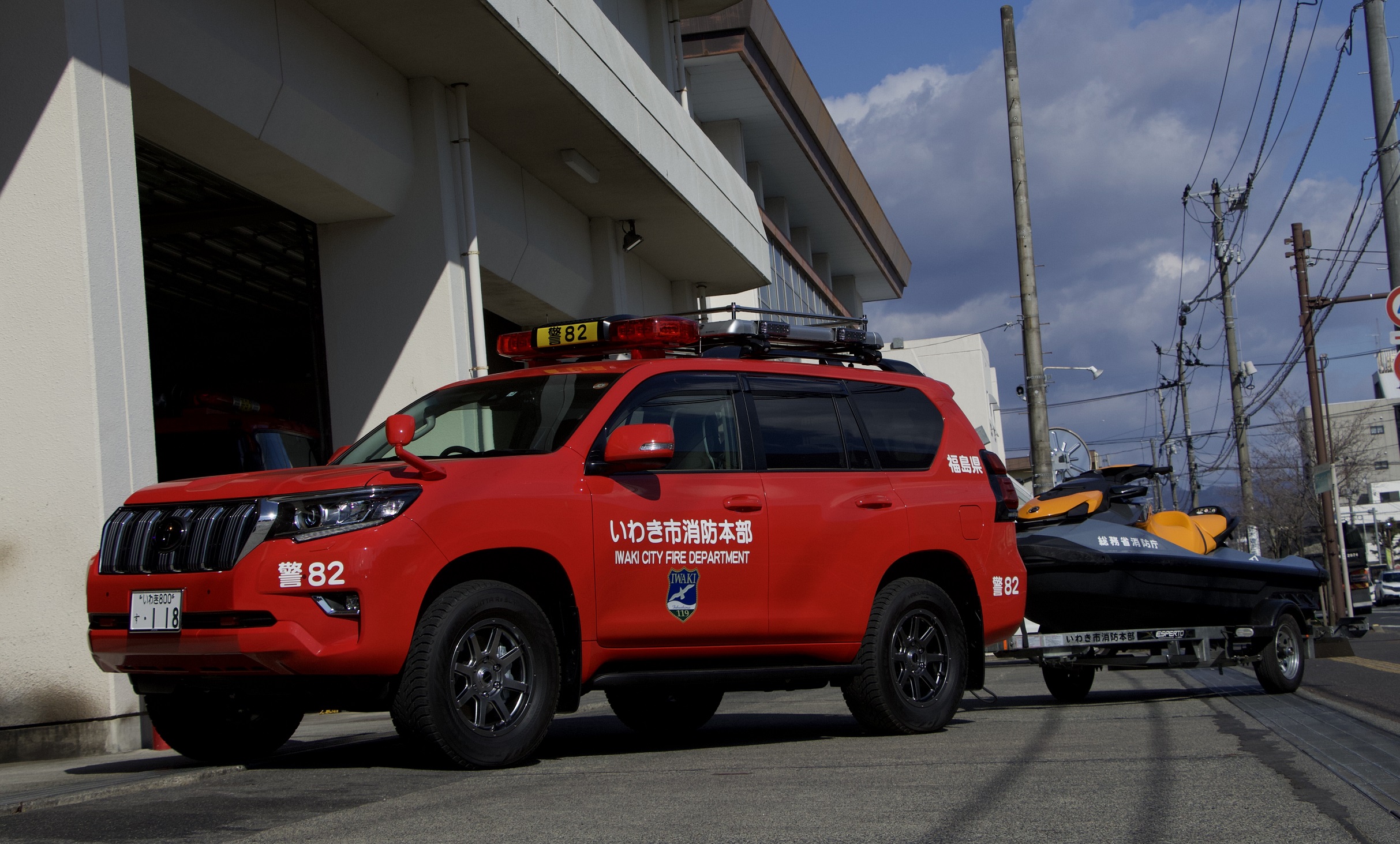 水上オートバイを牽引し、市内の水難救助事案に出動する車両です。冠水路やぬかるみ等、悪路にも強い車両であるため、大規模な水害や土砂災害が発生した際には、連絡車としても活躍します。