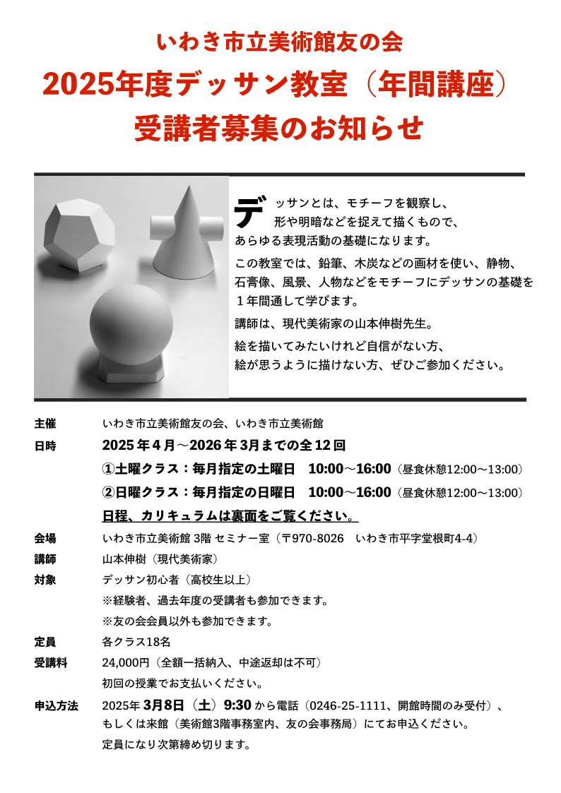 | 申込方法 | 2025年3月8日(土)9:30から電話(0246-25-1111、開館時間のみ受付)、もしくは来館(美術館3階事務室内、友の会事務局)にてお申込ください。定員になり次第締め切ります。 |