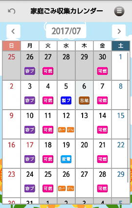 【ごみ収集カレンダー】お住まいの地区を設定することで、ごみの収集日をカレンダー形式で確認できます。 |