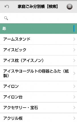 【ごみ分別検索】 ごみの品目名等を五十音順に一覧で表示し、分別区分や注意事項を確認することができます。 |