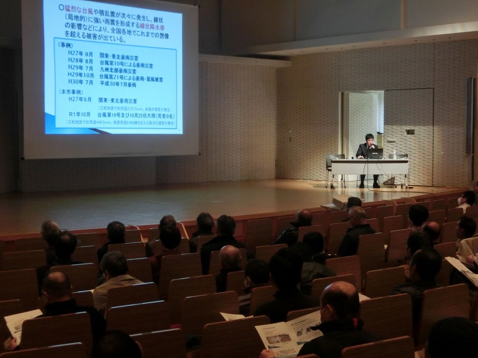 昨年10月に発生し、本市に甚大な被害をもたらした台風第19号における災害により、自助・共助による地域防災力や、自主防災組織の災害対応能力の向上が重要であることを再認識したことから、自主防災組織の代表者や地域の防災リーダーである防災士に、市の施策の周知や防災知識等の向上、各地区の組織間や、地区と防災士との情報共有及び連携の強化を目的に合同研修会を実施しました。