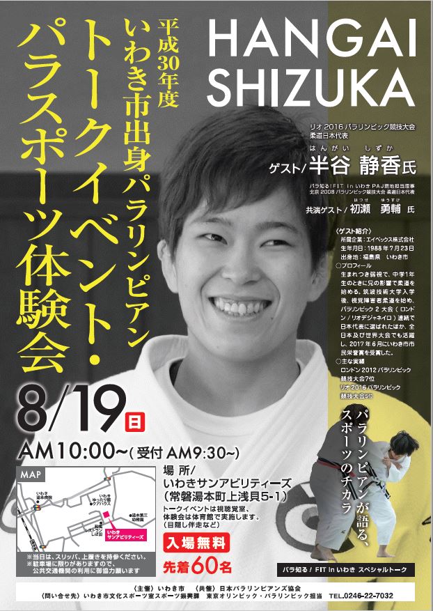 平成30年8月19日(日)に本市出身のパラリンピアンである半谷静香(はんがい しずか)選手をお招きし、次のとおり平成30年度いわき市出身パラリンピアントークイベント・パラスポーツ体験会を開催します。