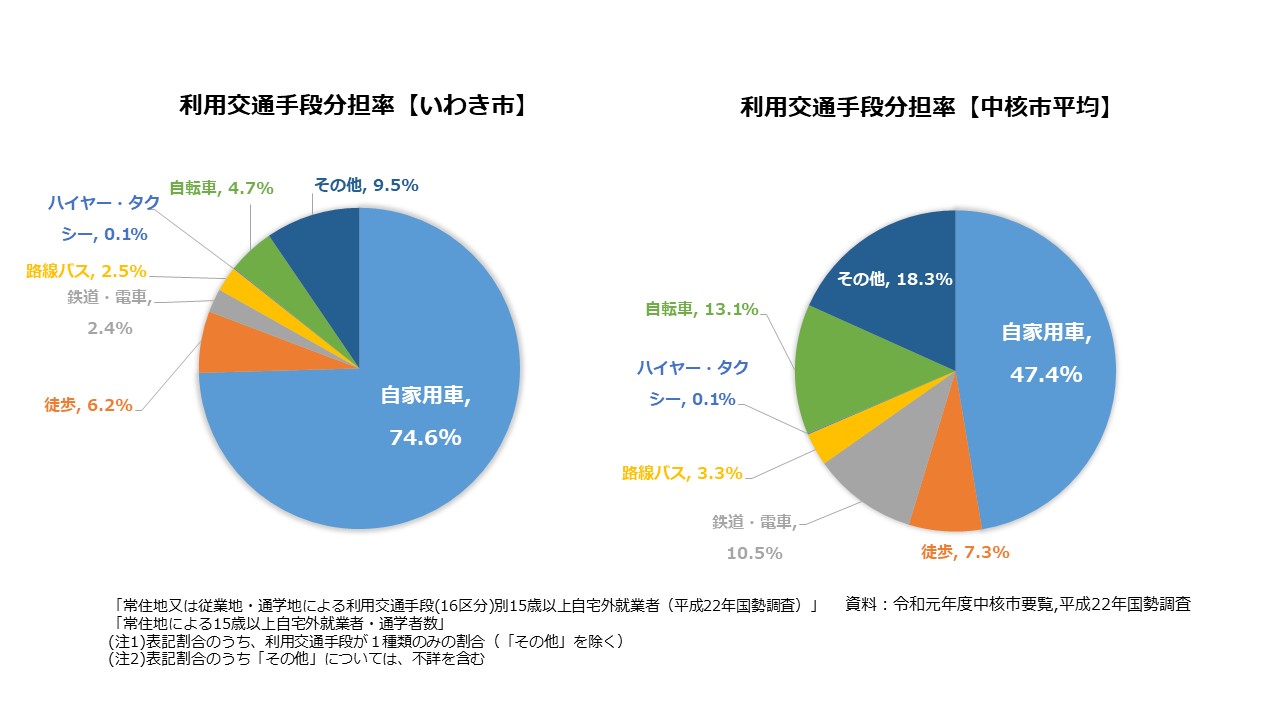 - 本市では、少子化や人口減少、自家用車(マイカー)の普及に伴い、他都市に比べ、自家用車(マイカー)の依存率が非常に高く(下図参照)、公共交通機関の利用者数は近年、減少傾向(下図参照)にあります。
