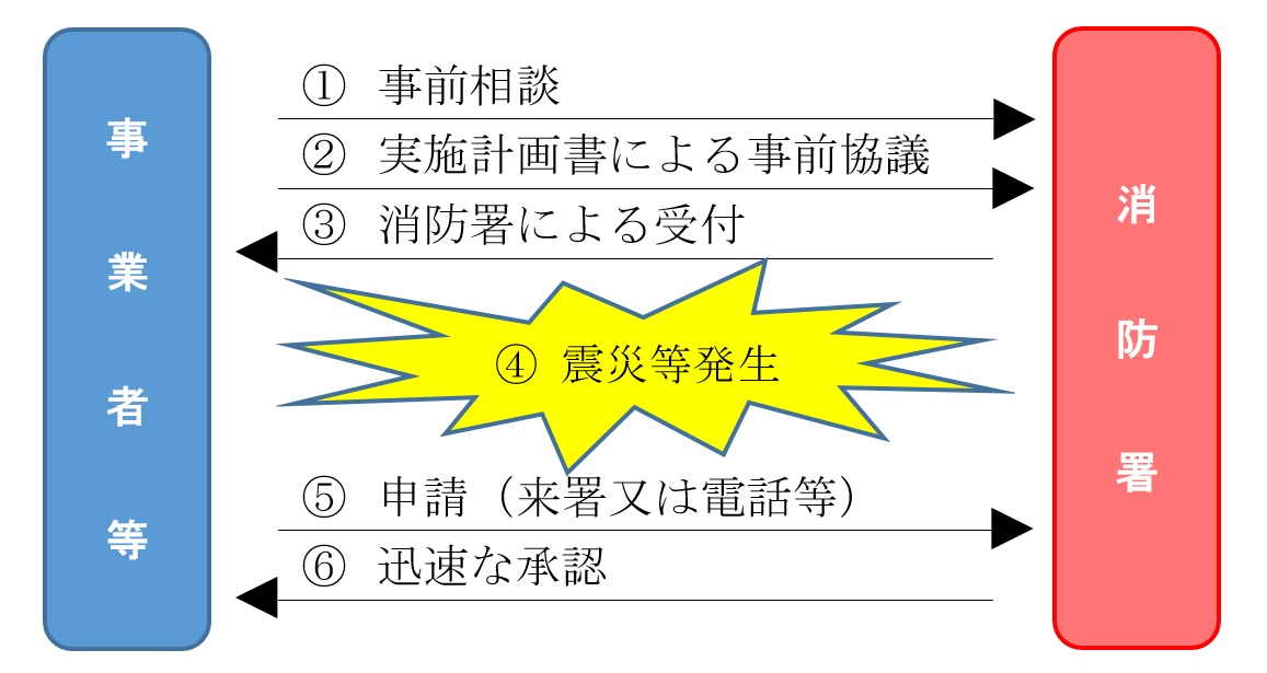 震災時等に指定数量以上の危険物の仮貯蔵・仮取扱い等を行おうとする者が、震災時等における実施計画書を作成し、消防署との間で事前に協議しておくことで、仮貯蔵・仮取扱いの申請から承認までの期間が大幅に短縮されます。