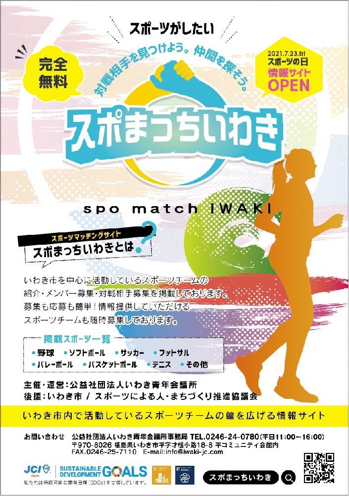 公益社団法人いわき青年会議所におきまして、市内で活動しているスポーツチームの環を広げるための情報サイトとして、「スポまっちいわき」を開設いたしましたのでお知らせします。