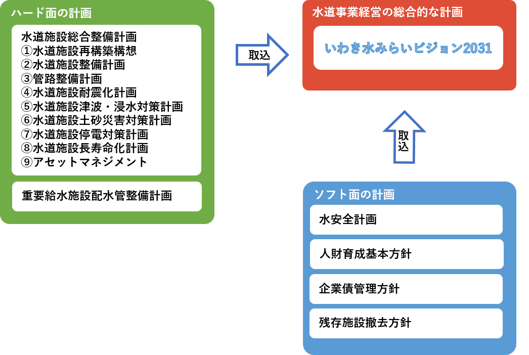 このいわき水みらいビジョン2031は、水道施設総合整備計画をはじめとするハード面の計画やソフト面の計画を取り込んで策定しています。