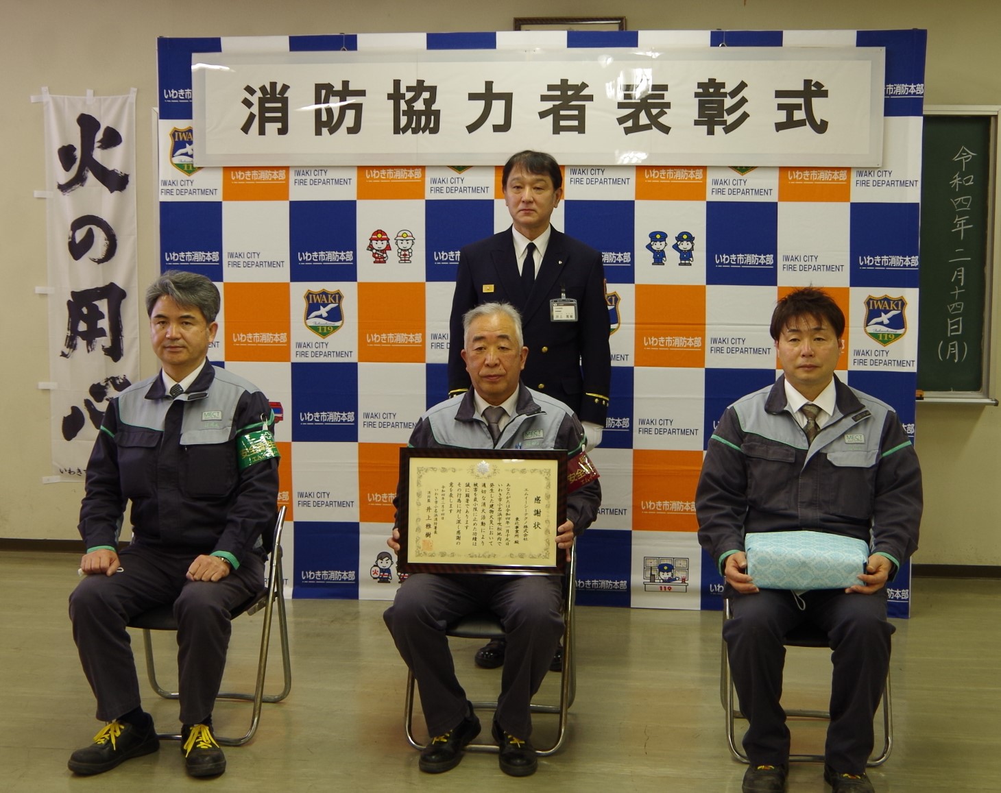 いわき市消防本部では、令和4年2月14日(月)、消防協力者のエムイーシーテクノ株式会社東北事業所様に対し、小名浜消防署長から感謝状を贈呈しました。