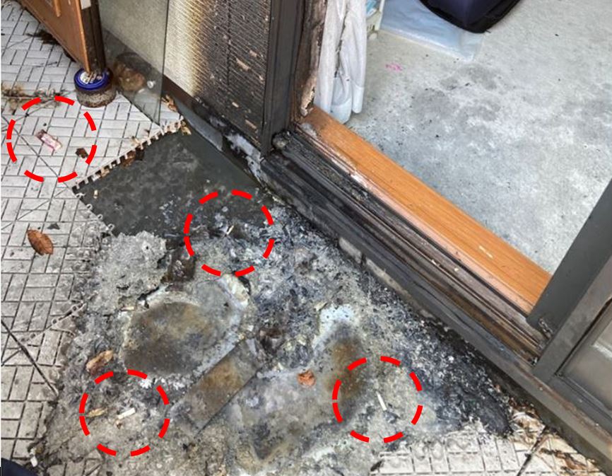 ※屋外の場合、たばこの火種が風の影響を受けて強く発熱し、より出火しやすい状況になるため注意が必要です。