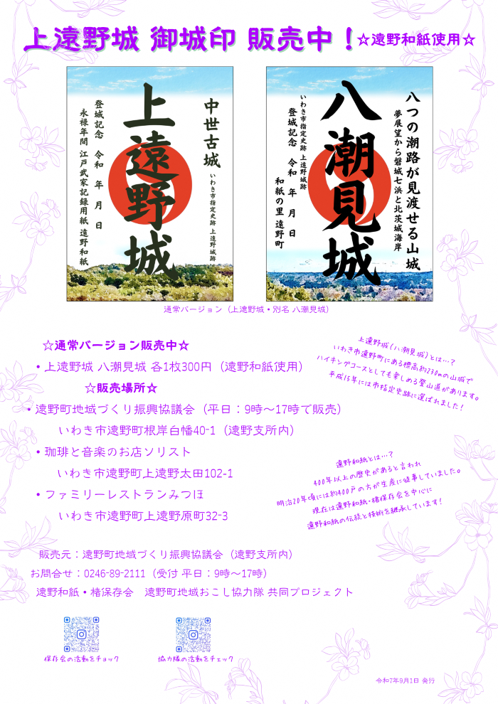 上遠野城(別名 八潮見城) 御城印 販売中!(遠野和紙使用)