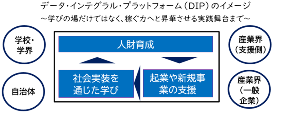 データを活用できる即戦力人材(経営者や従業員等の社会人)育成の仕組みを構築するため、本事業では、複数の市内企業のモニターを対象としたカリキュラムを実践しながら地域の中で人財育成を継続・自走できるような仕組み(データ・インテグラル・プラットフォーム(DIP))を構築します。