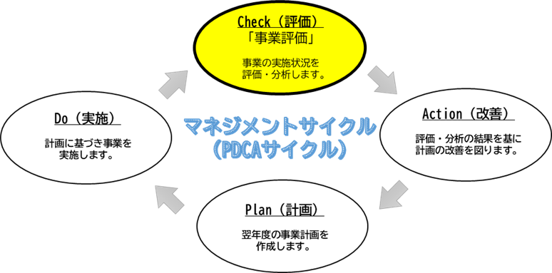 降の計画や予算に反映させることで、PDCAサイクルを確⽴させることとしています。事業評価は、PDCAサイクルのC(Check)に位置付けられます。