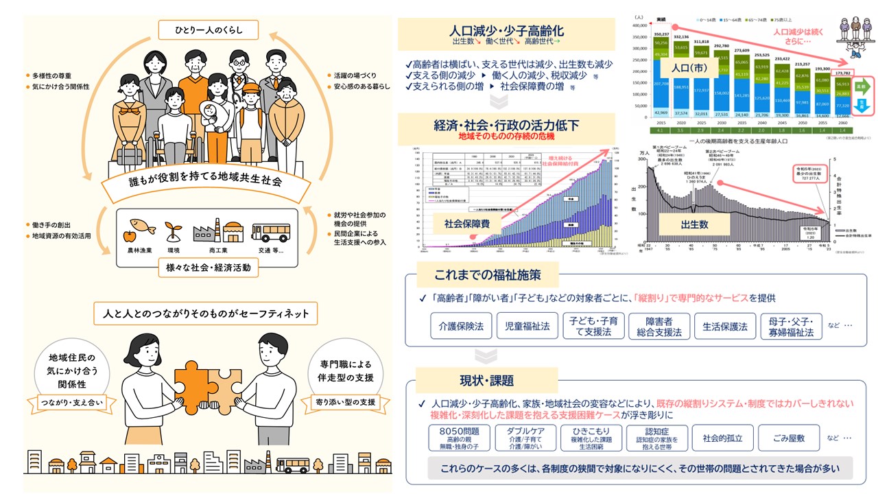 少子高齢・人口減少、地域社会の脆弱化等、社会構造の変化の中で、人々が様々な生活課題を抱えながらも住み慣れた地域で自分らしく暮らしていけるよう、「制度・分野ごとの『縦割り』や『支え手』『受け手』という関係を超えて、地域住民や地域の多様な主体が参画し、人と人、人と資源が世代や分野を超えてつながることで住民一人ひとりの暮らしと生きがい、地域をともに創っていく社会」=「地域共生社会」の実現が求められています。