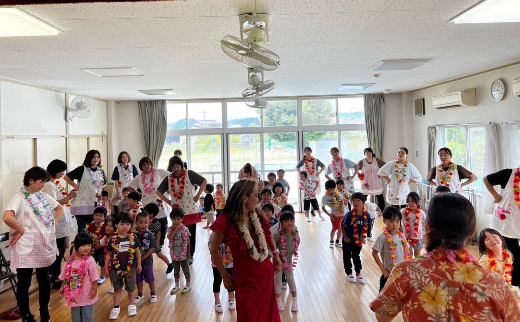 遠野保育所では、28人の子どもたちが参加し、みんなで楽しみながらフラを体験しました。