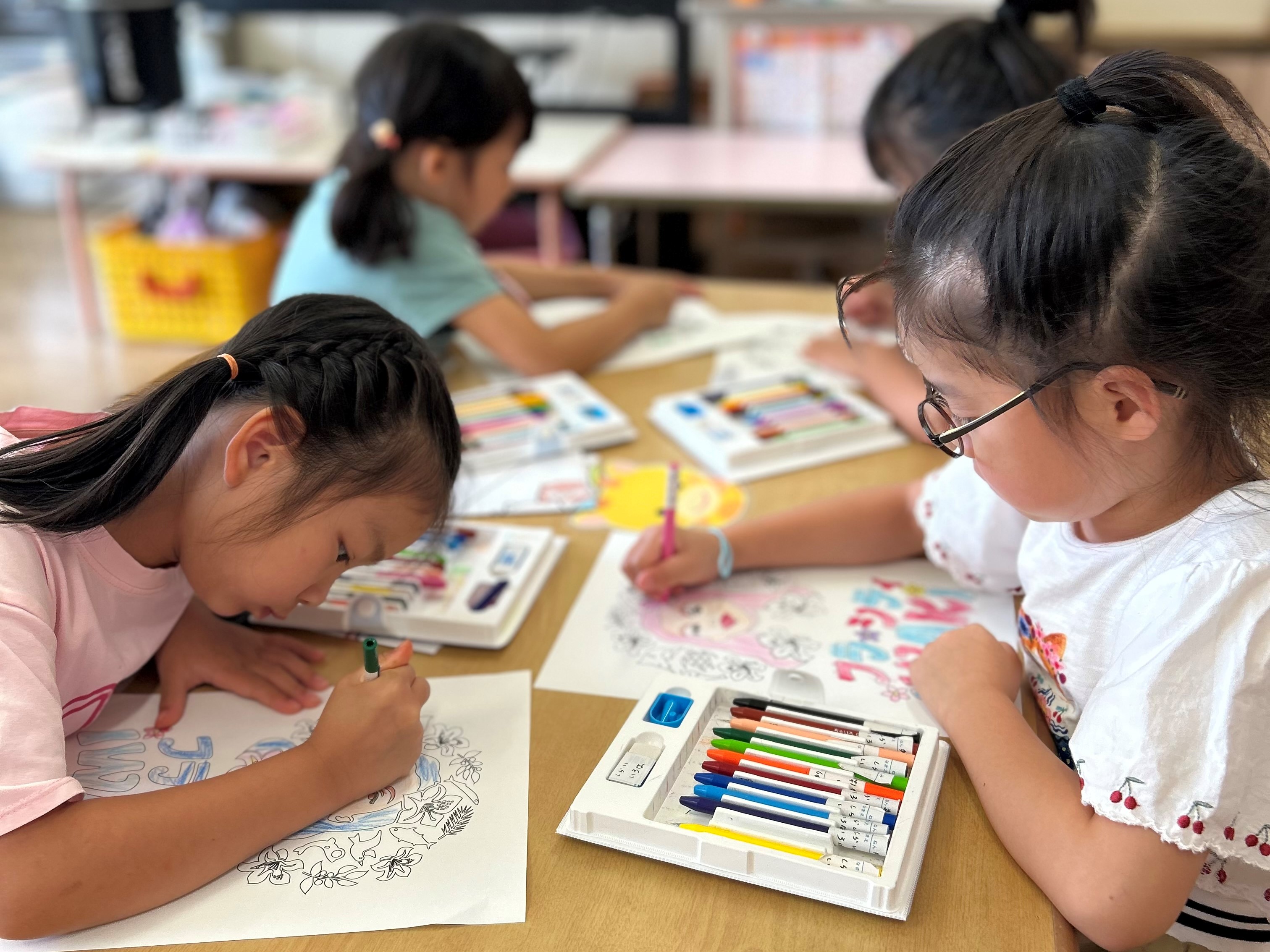 小川保育所では、40人の子どもたちが参加し、フラの体験や塗り絵に参加してくれました。