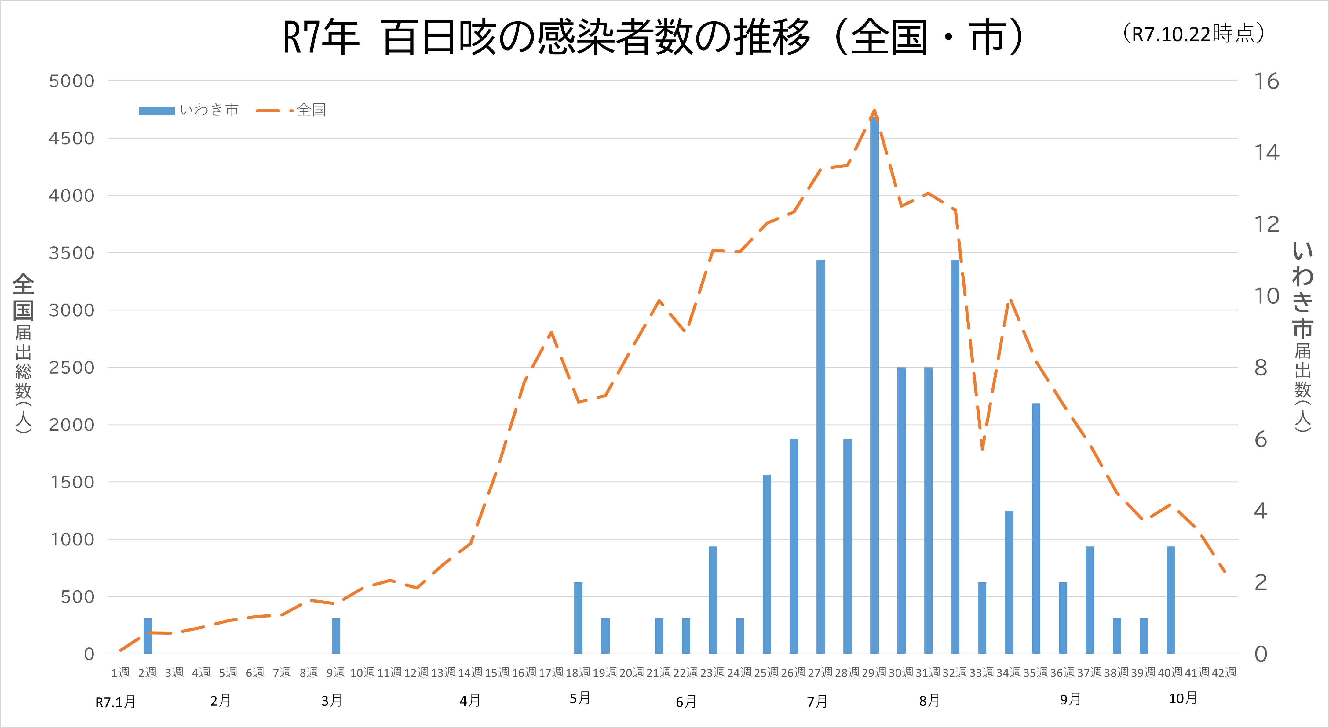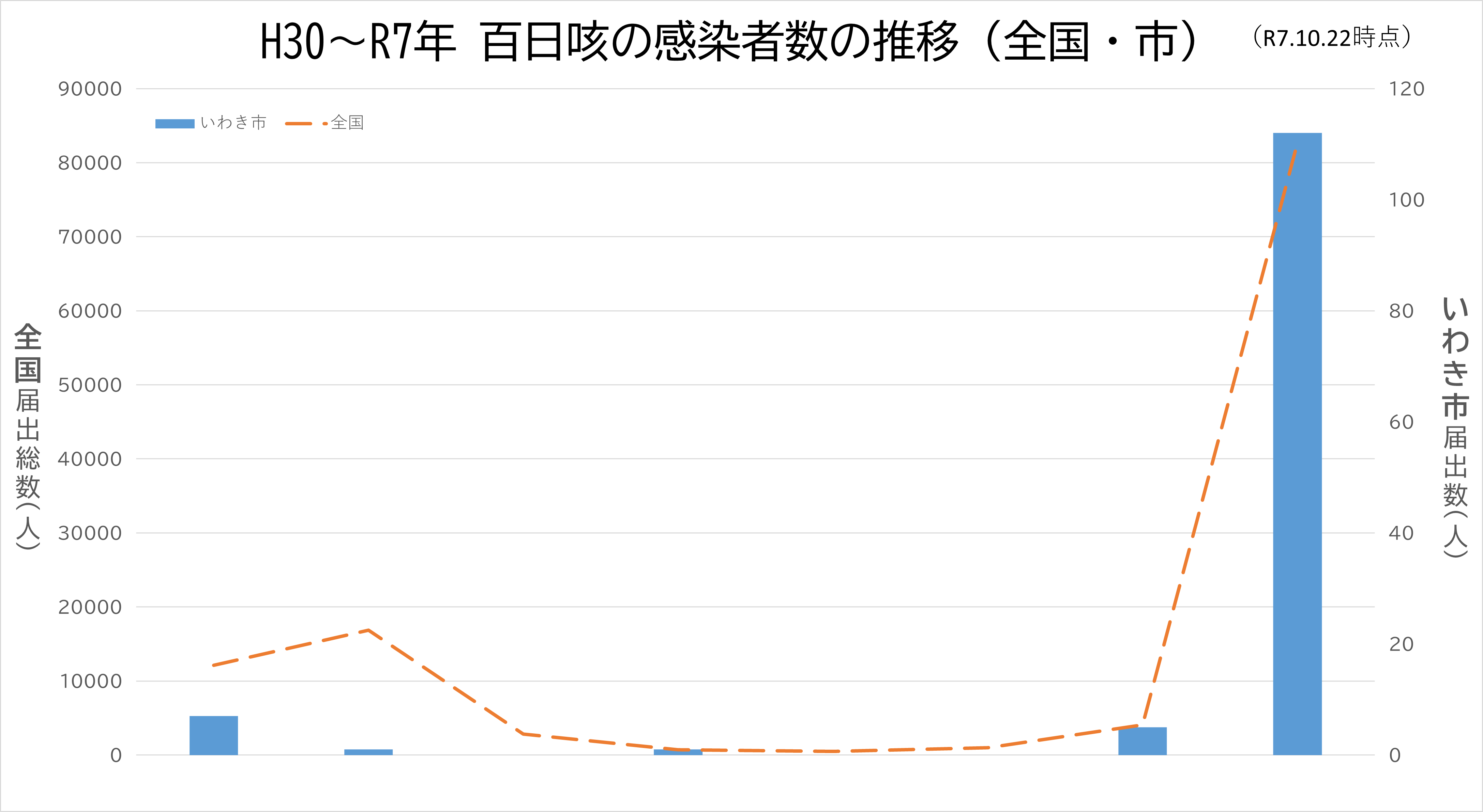 R7年、全国的に百日咳の患者報告数が、例年に比べ多くなっており、現在の集計法となったH30年以降で国の1年間の累計者報告数が8万人を超えるのは初めてです。