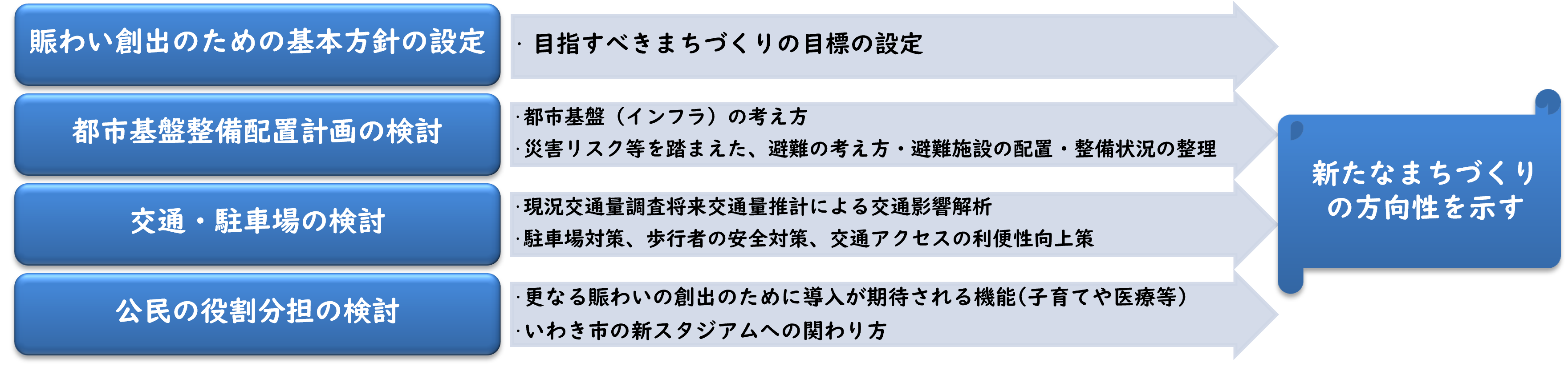 新スタジアムの整備によって、道の駅に登録された「いわき・ら・ら・ミュウ」や常磐自動車道と直結する小名浜道路の開通などとの相乗効果で、当該エリアにおける来街者の増加が想定され、回遊性の向上や滞在時間の延長が期待されます。
